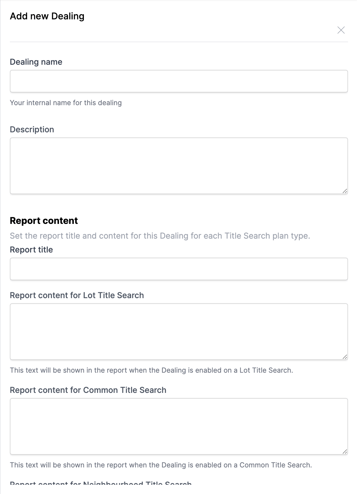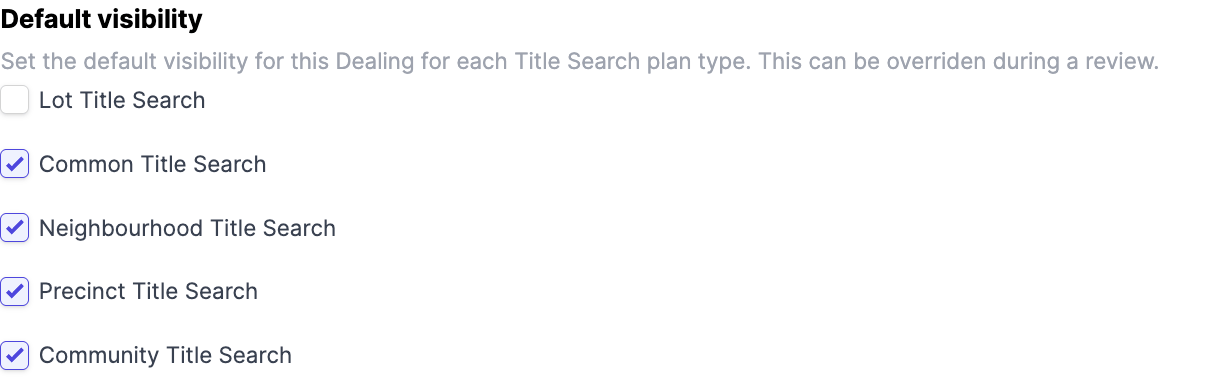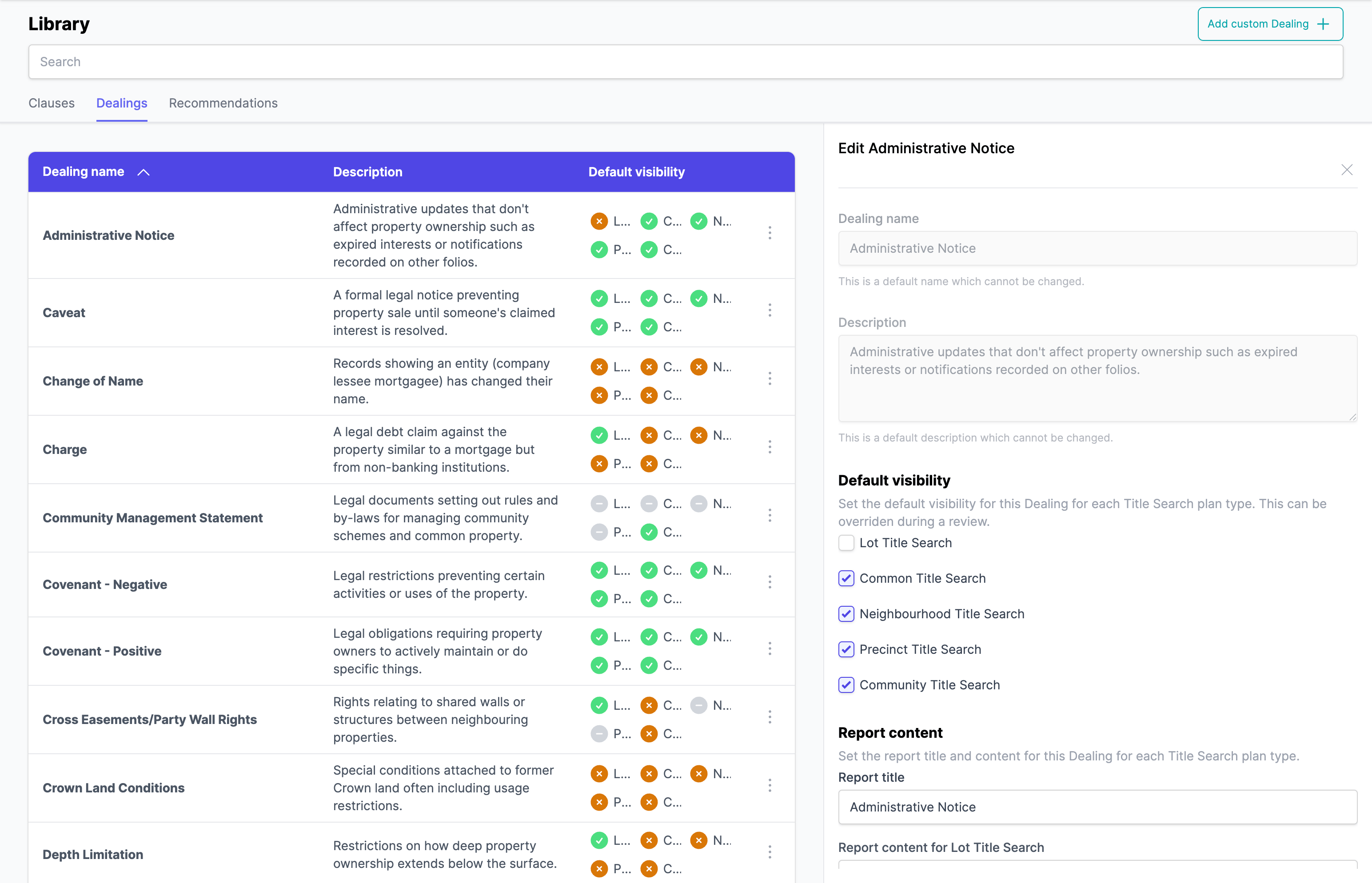 The Dealing library allows you to customise how different types of property Dealings appear in your contract reviews. You can set default visibility, create custom report content for different property types, and maintain consistency across all reviews in your account.