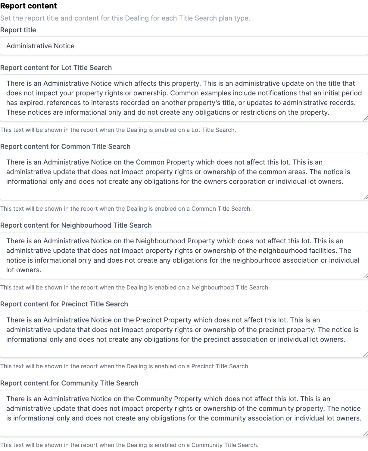 The report title is the heading that appears for the Dealing in your review report. This title is the same across all property types. You can customise this to match your firm's terminology or client preferences.