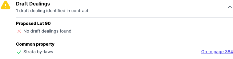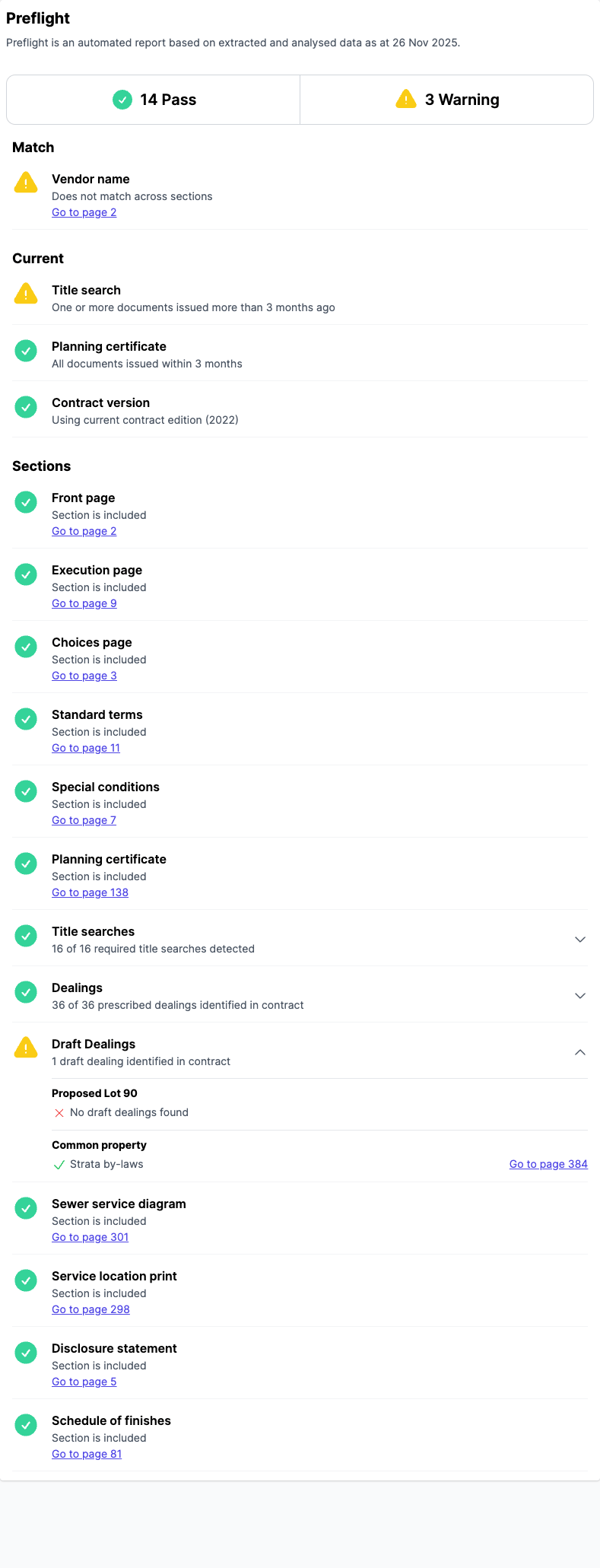 Note: Except for Title Searches and Dealings, section checks verify if ANY page of that section type is detected in the contract. For example, the Planning Certificate check passes if any planning certificate page is found - it does not validate individual planning certificates per title. Similarly for sewer diagrams and other document sections.
