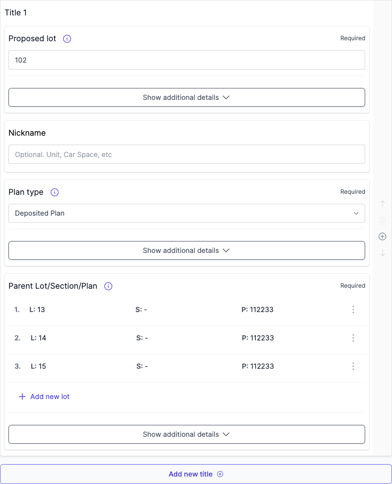Each proposed title includes a Proposed lot field that identifies the specific lot being purchased and a Parent Lot/Section/Plan field that identifies the parent titles to be subdivided.
