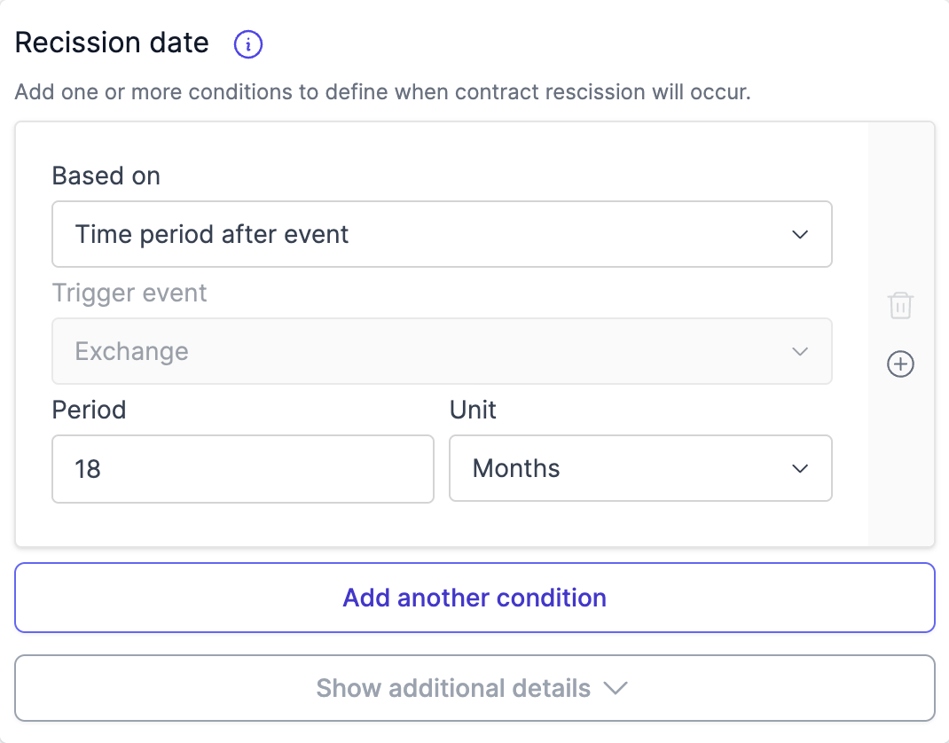 - When configuring any rescission condition, click "Show additional details" to reveal extension options.