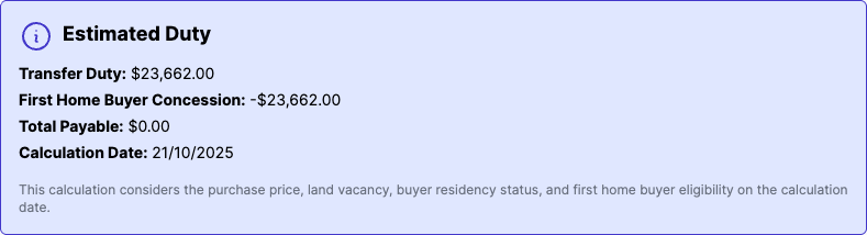 "We estimate transfer (stamp) duty of $0.00 is payable on this purchase. As a first home buyer, you are eligible for a full concession, reducing the duty from the standard amount of $23,662.00. This is calculated as at [exchange date]."