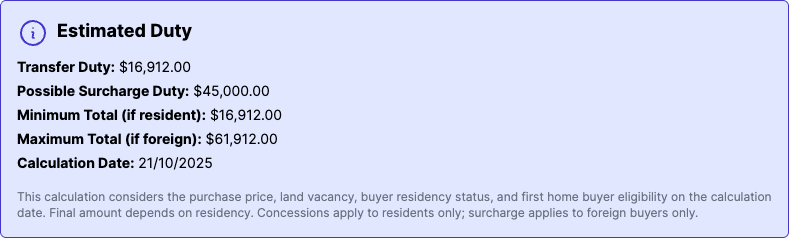 "We estimate transfer (stamp) duty in the range of $16,912.00 to $61,912 is payable on this purchase, calculated as at [exchange date]. The final amount depends on your residency status: