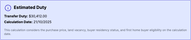 - Calculates the estimated transfer duty based on the purchase price and property state.