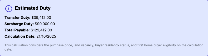 "We estimate total transfer (stamp) duty of $129,412.00 is payable on this purchase. This comprises the standard transfer duty of $39,412.00 plus a 9% foreign buyer surcharge of $90,000, calculated as at [exchange date]."